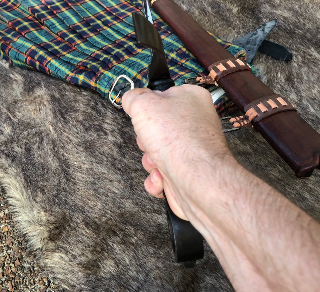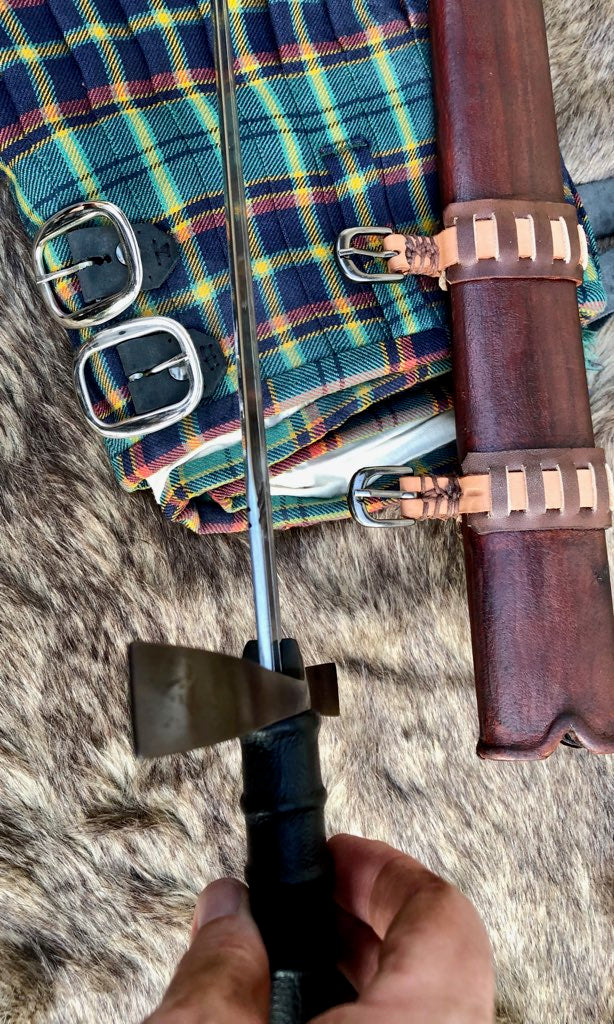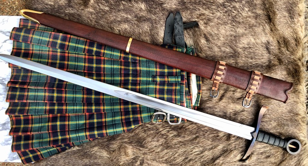 The Kingdom of Arms Elite Kern Irish Single Hand broadsword with Irish ring hilt features a hand hammered 5160 carbon steel blade as the originals were made, full tang, heat treated and tempered as the original swords were made for a strong yet flexible blade that will hold a very sharp edge. Fully functional (Battle Ready). The handle has a leather wrapped grip and "S" shaped quillons. Comes with a wooden scabbard with leather accents and with hangers attached.