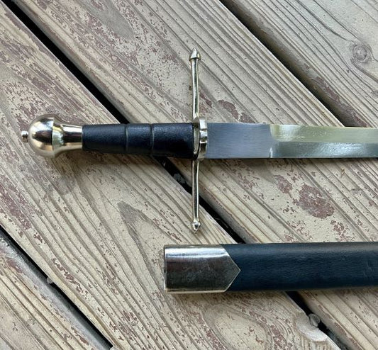 This new economy line of well-designed historical medieval and renaissance swords and daggers. In an effort to supply very good quality at low prices with today’s high import costs this line will all be unsharpened but will still include a high quality scabbard. The pieces are from high carbon C60 carbon steel, from a quality foundry in India, and are well tempered and can be sharpened at home by hand if so desired. To sharpen start with a fine mill-bastard file and at about 25 degrees pass from the base of the blade to the tip in even strokes going from one edge to the next. After the edge is stated use a medium stone and then if you desire a fine stone passing it up the edge in the same fashion as the file. Look for more designs coming soon!