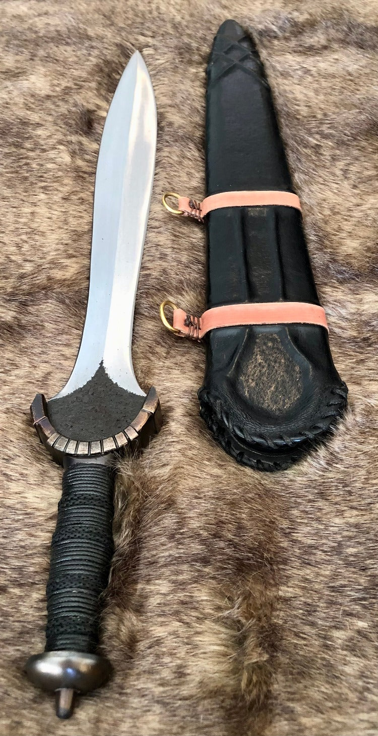 Celtic War Sword: The Hallstatt Culture is the earliest to be identified as associated with Celtic culture, spreading from north of the Alps West into France, Southern Britain and the Iberian Peninsula. The earlier phases of the Hallstatt era fall into the Bronze Age. Swords seem to have been the primary weapon from this period, perhaps indicating that warfare was a relatively small-scale affair, possibly between groups of élite warriors. In the latter phases of the Hallstatt era, iron began to replace bronze in the manufacture of weapons and the classic "Celtic longsword" with its leaf-bladed design made its appearance. They also with this style started to add carbon to make a mild steel which was better than the iron. Not as good of grade steel as most of us who either make or have made swords.