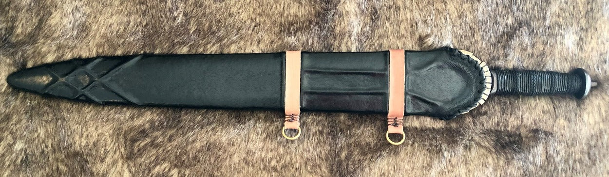 The Kingdom of Arms replica version of this Celtic Leaf Blade Sword features a hand hammered 5160 carbon steel leaf blade as the originals were made, full tang, heat treated and tempered as the originals, for a strong yet flexible blade that will hold a very sharp edge. Includes in the Ricasso section the raw forged surface. Exotic hardwood handle, with steel accents. Fully Functional (Battle Ready)! Comes with a wooden sheath wrapped in leather with leather accents.
