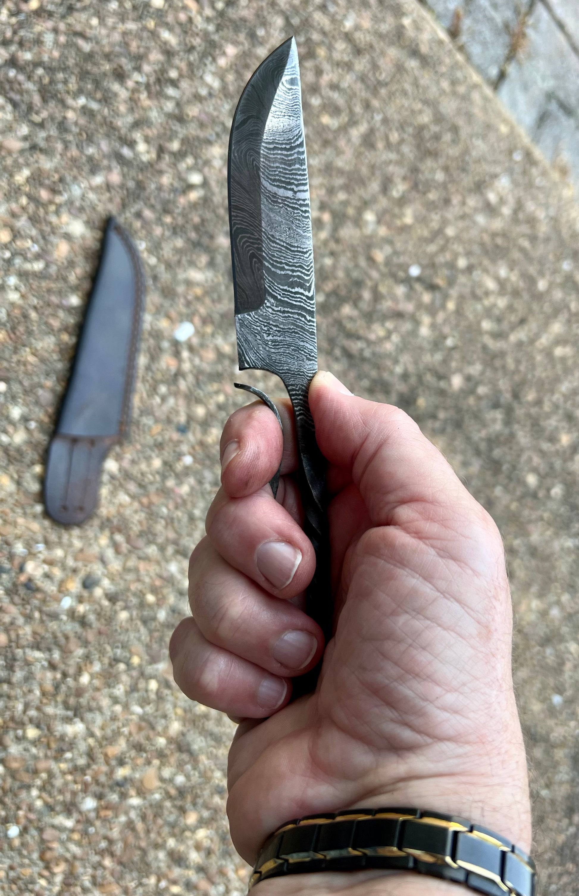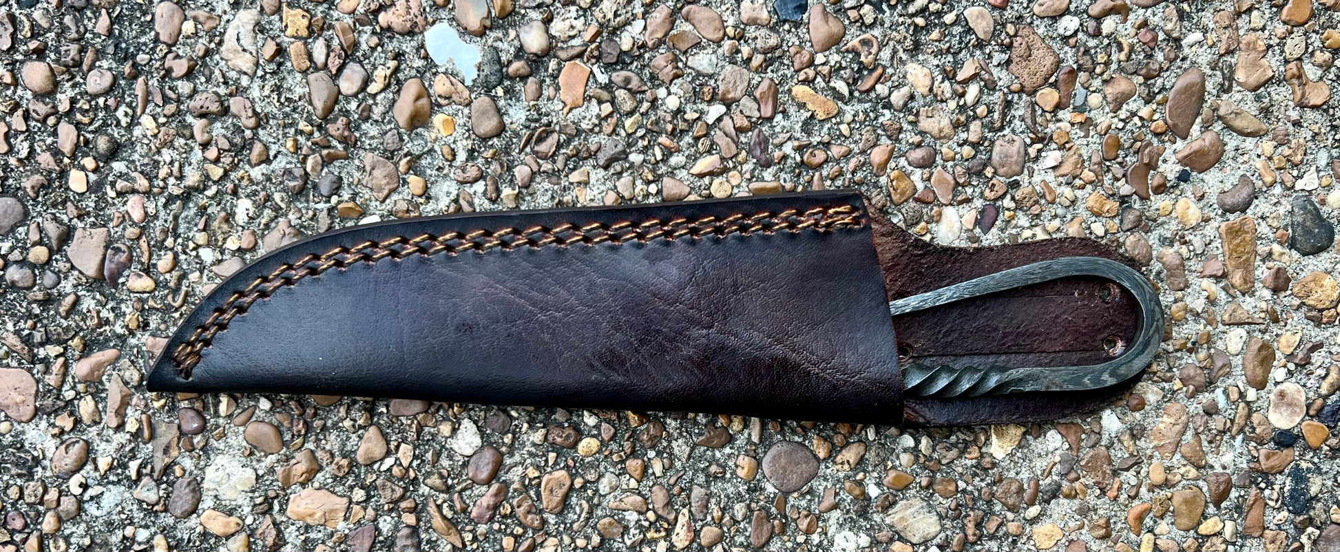 The silverware you used when serving your guests at a Noble Medieval Feast, when inviting the King or Queen,can really make or break an event. What better way to compliment your meal than with an elegant banquet knife? This gorgeous piece is made entirely of 1095/15N20 Damascus steel. From tip to end you can see the graceful wave-like pattern that these blended steels produce. The blade is forged into a drop point style and features a standard sharpening. The handle has been masterfully twisted and the end bent back inward towards the blade. Though it is a functional piece, this delicate design is better to slice into softer materials such as cheese on your holiday charcuterie board or to cut your wedding cake in style! Included with this beauty is a hand tooled sheath made from genuine bovine leather.