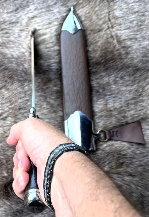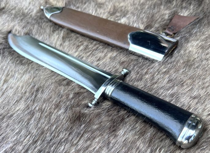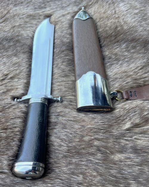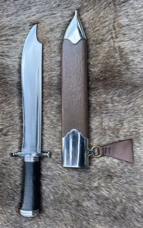 A major past time for nobles throughout the Middle Ages and the renaissance was the hunt. This stylish knife is large enough to disjoint game, as it was common practice to cut away the desired parts and leave the rest for the wolves. This knife would have also served as an effective fighting knife as well, being light and fast. Steel parts with a wood grip covered in glove leather are peened onto the lightly re-curved blade. Wood covered with leather with ring and belt loop for ease of carry. Exceedingly sharp blade from tough 5160-carbon steel.