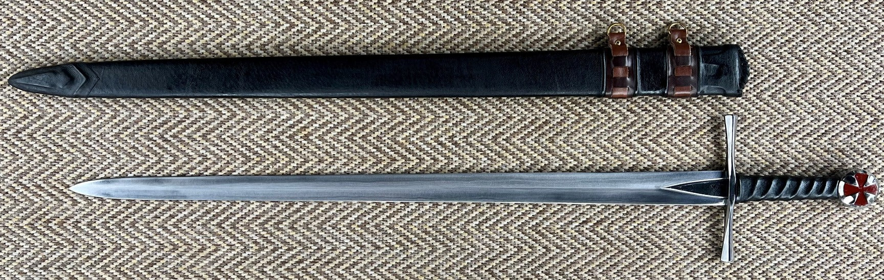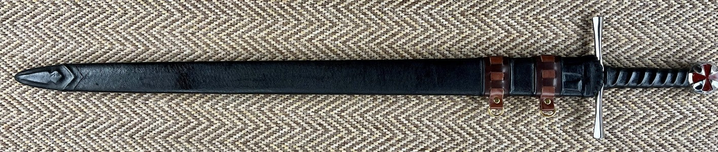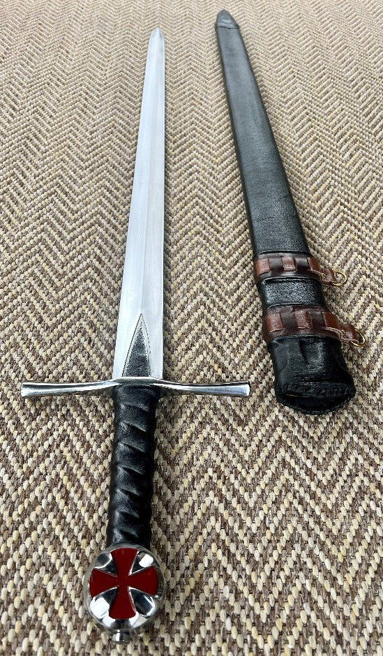 The Kingdom of Arms Nobility Templar Knight Sword features a hand hammered 5160 carbon steel blade as the originals were made, full tang, heat treated and tempered as the originals, for a strong yet flexible blade that will hold a very sharp edge, with a leather wrapped handle and polished pommel with brass cross inset in the pommel, and blued quillons.  Fully Functional (Battle Ready)! Comes with a wooden scabbard with leather accents and with hangers attached.