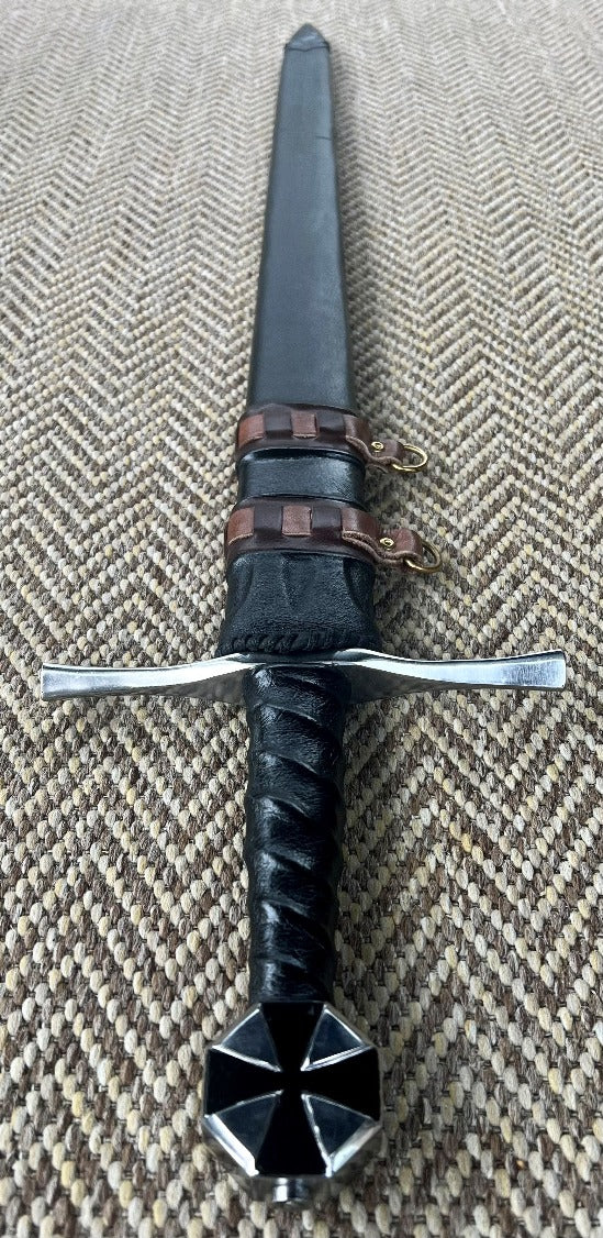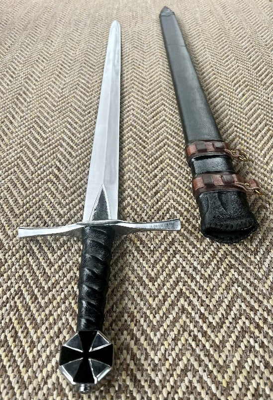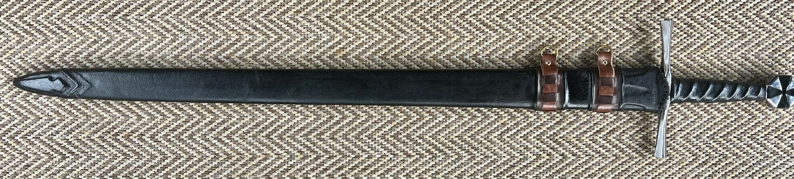 The Kingdom of Arms Nobility Teutonic Knight Sword features a hand hammered 5160 carbon steel blade as the originals were made, full tang, heat treated and tempered as the originals, for a strong yet flexible blade that will hold a very sharp edge, with a leather wrapped handle and blued pommel with brass cross inset in the pommel, and blued quillons. Fully Functional (Battle Ready)! Comes with a wooden scabbard with leather accents and with hangers attached.