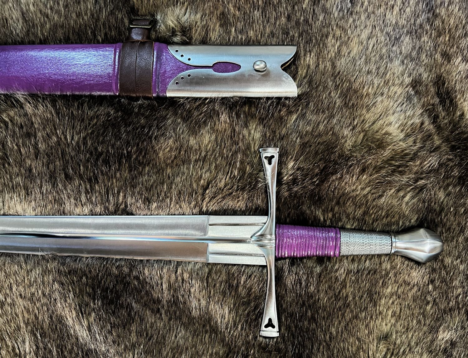 - Custom wood-core scabbard – wrapped in matching purple leather with decorative steel fittings